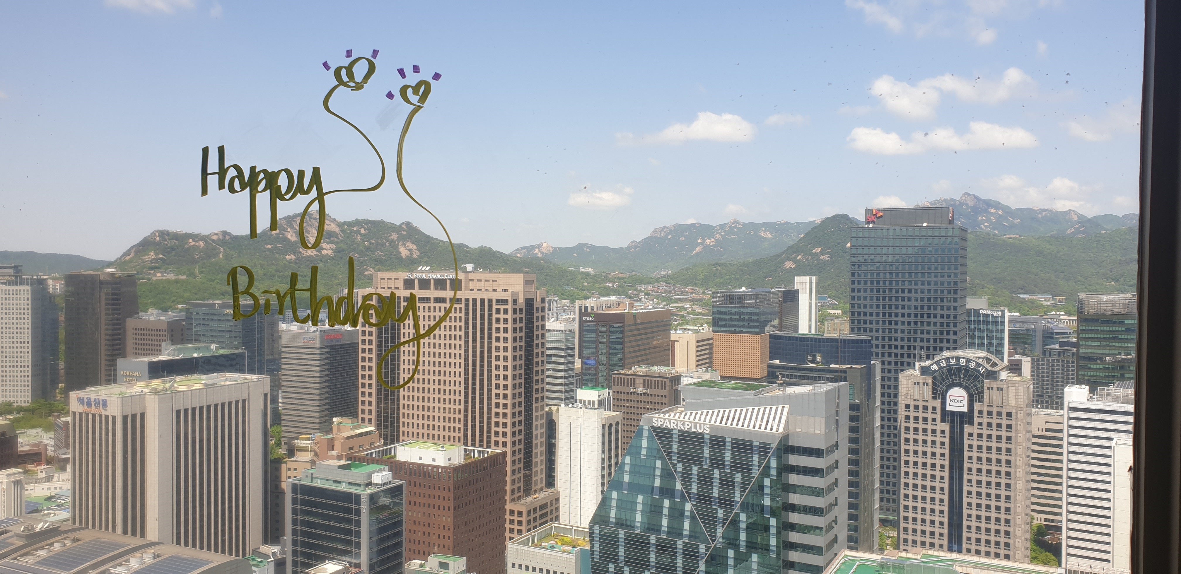 38층에 위치해 있다보니 빼어난 도심 조망을 자랑하는데, 경치보다 더 인상적이었던 것은 "Happy Birthday"라는 문구였다. 메뉴판 뿐만 아니라, 창문에도 저런 섬세한 작업을 해놓았다니, 연속으로 감동을 받았다.