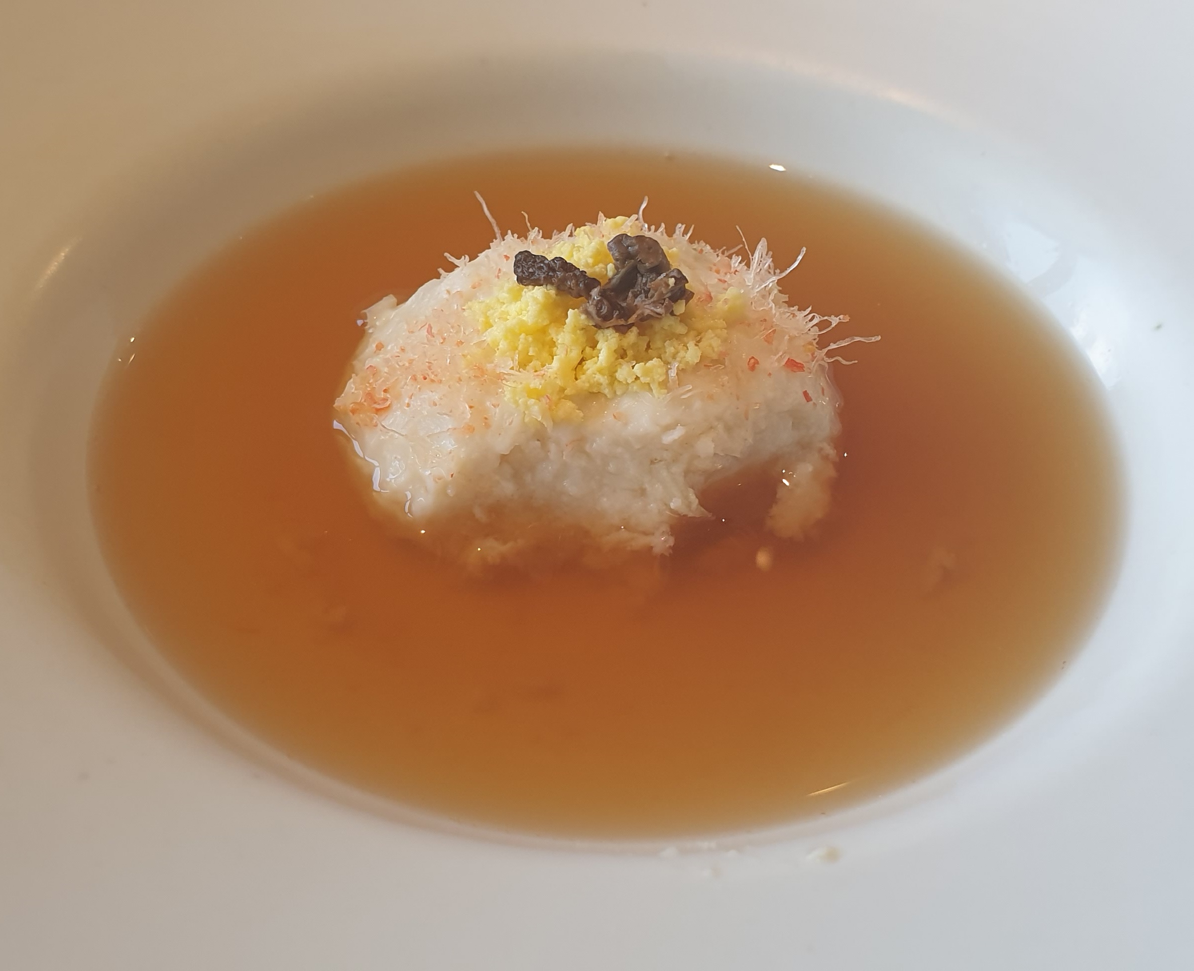 코스의 첫번째 음식인 주전부리가 나왔다. 왼쪽 네모난 주전부리들은 입에서 바삭바삭 부드럽게 사르르르 녹는 식감을 가졌고, 오른쪽 컵에 담긴 것은 스프이다. 원샷으로 가볍게 들이키면 되는데, 굉장히 건강하면서도 담백한 맛이었다.